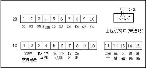 注:第一个和第二个端子接系统220V电压;选配系统电压跟踪时,UAX,UBX分别接电网的A相和B相。当励磁变压器接法为Y/△-11时,Ua,Ub接的是发电机机端A相,B相,不能接其他的电压信号组合,且不能接反;IC入和IC出指的是发电机C相定子电流互感器的进和出,不能接反,也不能接其他相电流互感器信号;当励磁变压器接法不为Y/△-11时,接线要根据实际情况来接,详见装箱说明书或致电我公司技术人员。当功率单元为三相半控桥时,接脉冲输出信号G1,G3,G5,K135;当为三相全控桥时则G2,K2,G4,K4,G6,K6也要接。当为单相半控时,接线详见装箱说明书或致电我公司技术人员,客户购买时需指定是功率单元时三相还是单相,是全控还是半控,除了硬件有差异,且软件方面也有不同。上位机端口为DB9针母头串口,需选配,DB9九针中2,3,5为信号位。COM和断路器辅助节点接的是发电机机端断路器的独立的常闭辅助节点,此节点为无源节点不能和其他回路合用。COM是公共端,与增励/减励/灭磁分别接增励/减励/灭磁按钮实现远程控制