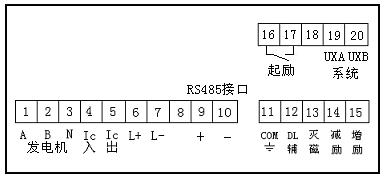 注:A,B,N指的是发电机机端A相,B相和零相;IC入和IC出指的是发电机C相定子电流互感器的进和出,不能接反,也不能接其他相电流互感器信号;L+,L_接的是交流励磁机励磁绕组的正端和负端 ,不能接反。选配远控起励和系统电压跟踪时,UXA,UXB接电网A相和B相电压,“起励”常开输出节点(有源节点)接常开按钮实现远控起励。COM和断路器辅助节点接的是发电机机端断路器的独立的常闭辅助节点,此节点为无源节点不能和其他回路合用。COM是公共端,与增励/减励/灭磁分别接增励/减励/灭磁按钮实现远程控制